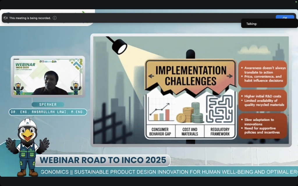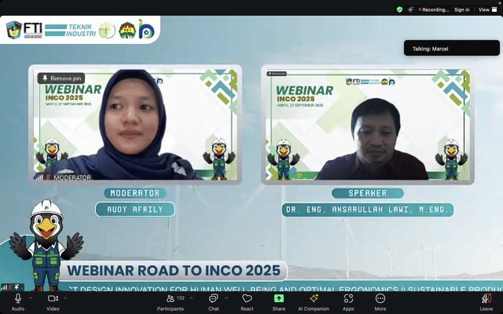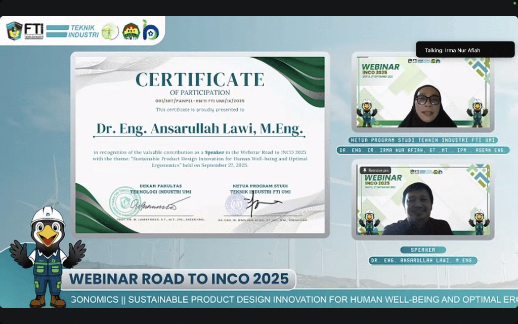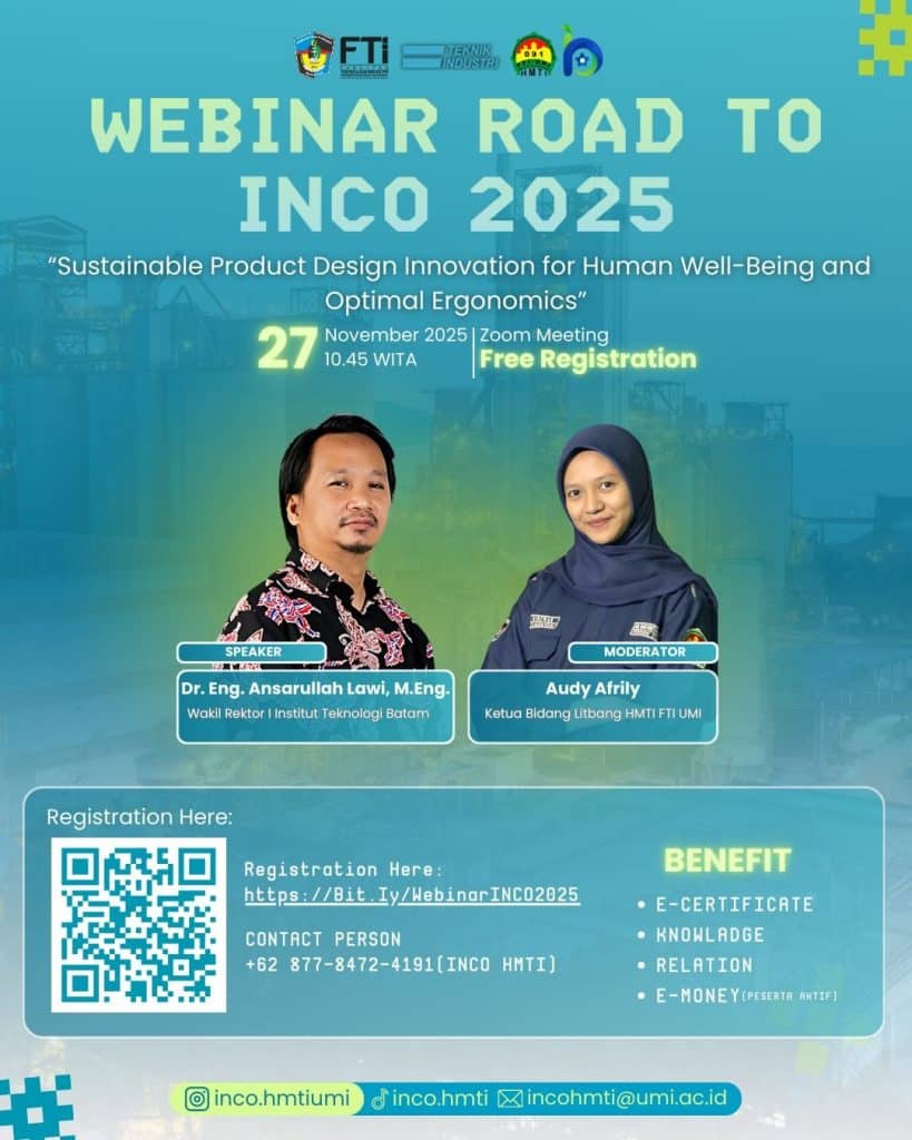 Webinar yang dimoderatori oleh Audy Arfily, Ketua Bidang Litbang HMTI FTI UMI, ini diharapkan dapat memotivasi peserta untuk terus berinovasi dan berkolaborasi dalam menciptakan desain produk yang berkelanjutan. Melalui Webinar Road to INCO 2025, FTI UMI memperkuat sinergi antara akademisi, mahasiswa, dan praktisi industri dalam menjawab tantangan global dan membangun masa depan yang lebih baik.